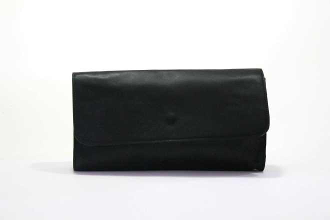 Uitvoering: zwart runderleer, voering blauwe pigskin, een groot ritsvak.
