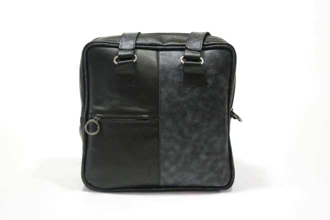 Uitvoering: zwart runderleer, voering blauwe pigskin, een groot ritsvak met kaartvakjes. De tas sluit met een rits aan de bovenzijde.